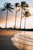 Four tall palm trees stand against a warmly lit sky as the sun sets on a tranquil beach. Gentle waves wash over the sandy shore, creating a peaceful scene.