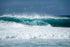 A powerful ocean wave crashes with full force, spraying mist into the air. The sea is a striking shade of blue, capturing the energy of the ocean.